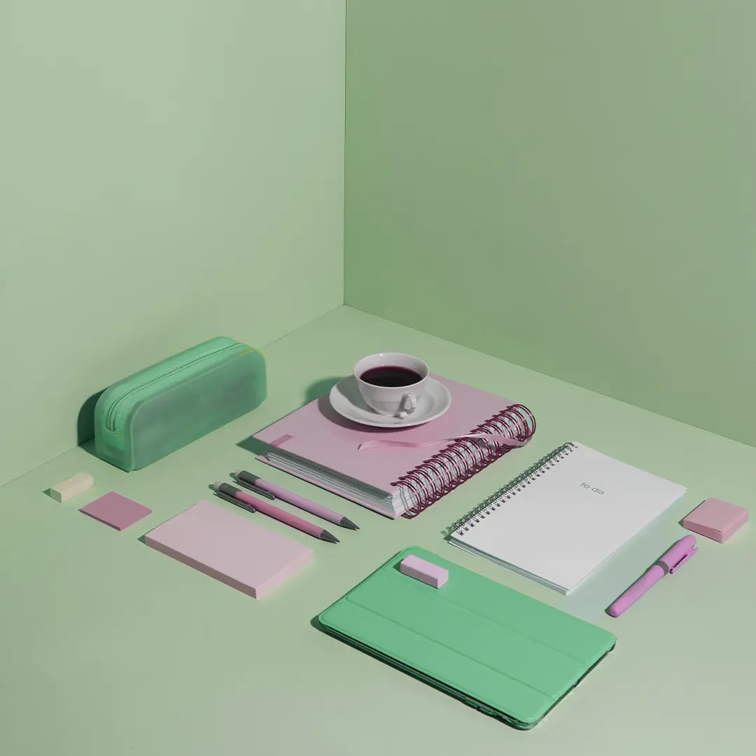 اللوازم المكتبية الأساسية: الأقلام، والدفاتر، والورق، والملفات، والدباسات، وغيرها من الضروريات اليومية.