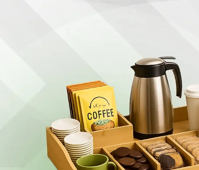 Because a comfortable and welcoming work enviroment enhances productivity , we offer a wide selection of hospitality essentials for your emplooyes and guests