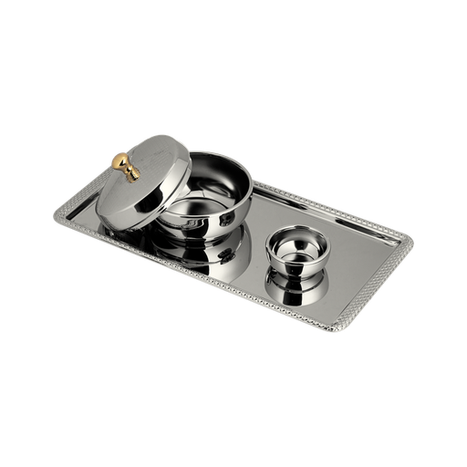 طقم ضيافة مميز من السيف – 3 قطع (صينية تقديم، تمرية، وصحن نواء) / تصميم أنيق بلون نيكل ذهبي يلفت الأنظار / مثالي لتقديم التمر والضيافة بأسلوب يجمع بين الفخامة والذوق الراقي / إضافة مثالية لطاولتك في المناسبات والزيارات الخاصة