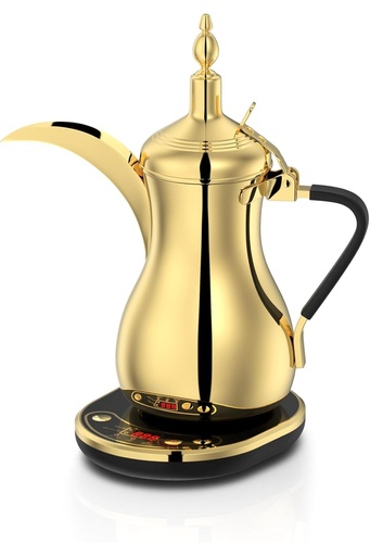 دلة السيف الكهربائية بلون ذهبي أنيق، سعة 1 لتر، بقدرة 900 واط، مثالية لتحضير القهوة العربية بسرعة وجودة عالية.